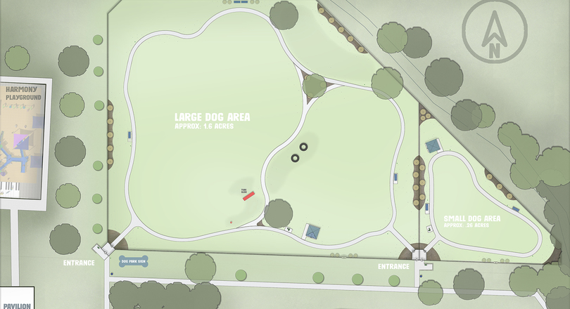 This beautiful one+ acre dog park will provide owners and their four-legged friends the room to get some extra steps in and run. Owners will have the option of releasing their dogs within either a large or small dog section. Both sections will be fenced and double-gated with entry corrals, so dogs can be let off leash before entering the park. ADA accessible walkways will be provided throughout the park. A pavilion, shade structures, benches, waste stations, and human water fountains with a dog-level water bowl and spout are included on the plans for the park property. There will also be a rinsing station to clean up your canine before putting him/her in your vehicle.